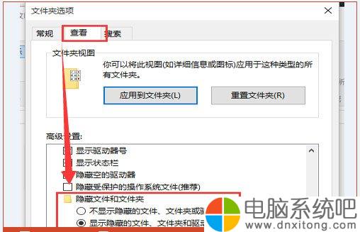 2、在弹出选项卡中,点击“查看”,并滚动滚动条,选中“显示隐藏的文件、文件夹和驱动器”,点击确定并退出;