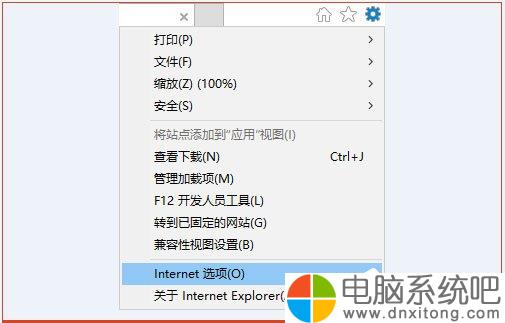 3、启动IE浏览器,在浏览器中,找到“设置”→“Internet选项”。有些IE的版本界面不一致,大致就是“齿轮”形状的设置按钮,或者为“设置”字样;