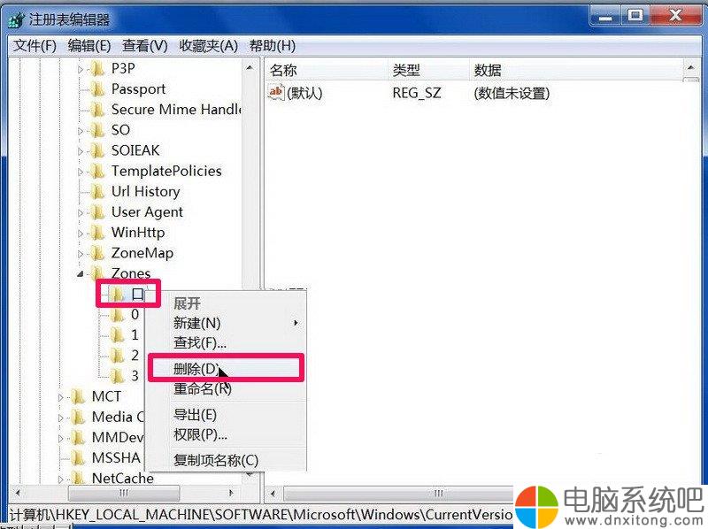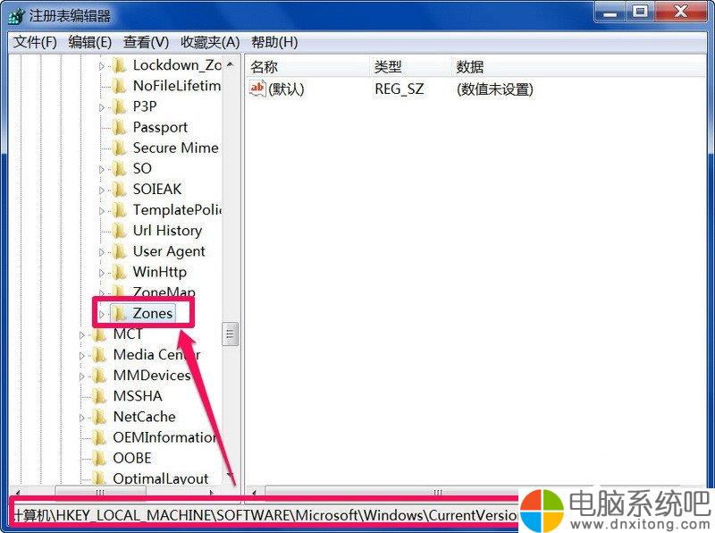 4、在子键中,依路径依次打开[HKEY_CURRENT_USER\Software\Microsoft\Windows\CurrentVersion\Internet Settings\Zones],最后定位于Zones之上。