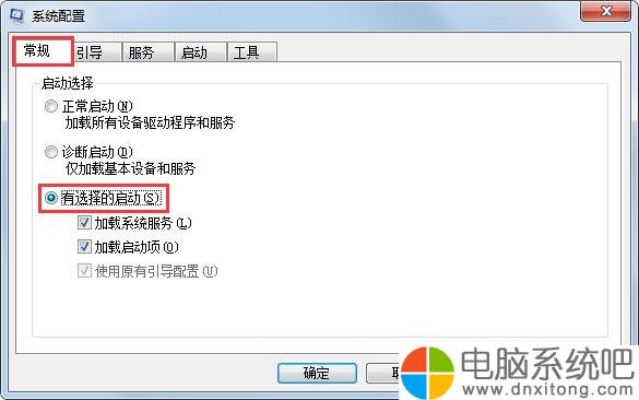 4、在“常规”选项卡上,单击“有选择的启动”;