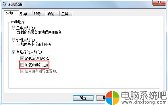 5、在“有选择的启动”下,单击以清除“加载启动项”复选框;