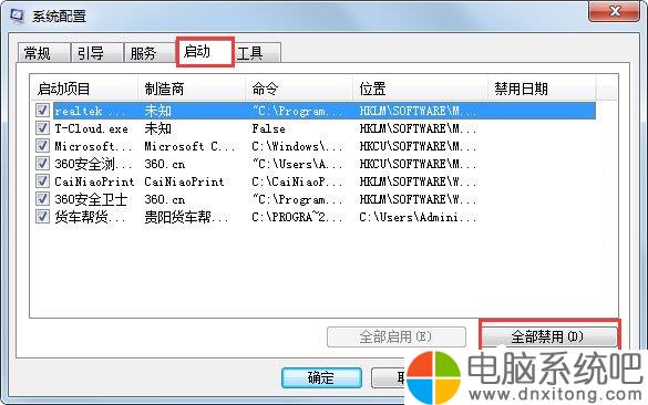7、单击“启动”标签卡,然后点击“全部禁用”并确定;