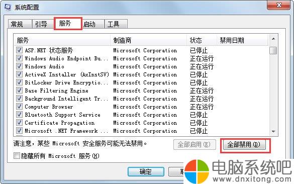 6、单击“服务”选项卡,单击以选择“隐藏所有Microsoft服务”复选框,然后单击“全部禁用”;