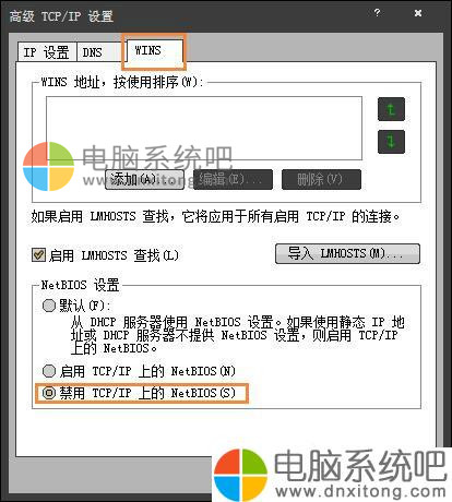 6、点击WINS选项卡如下图位置勾选“禁用 TCP/IP 上的 NetBIOS”,对所有已打开的选项窗口点击“确定”;