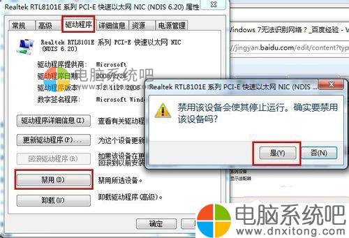 4、切换到“驱动程序”标签,点击“禁用”,弹出禁用该设备会使其停止运行的对话框,点击“是”按钮;
