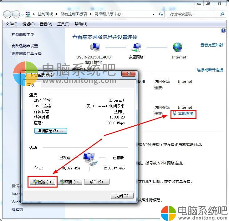 2、在查看活动网络中单击本地连接,弹出的本地连接状态窗口单击“属性”按钮;