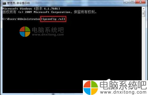 7、在命令提示符窗口中键入ipconfig /all,回车;