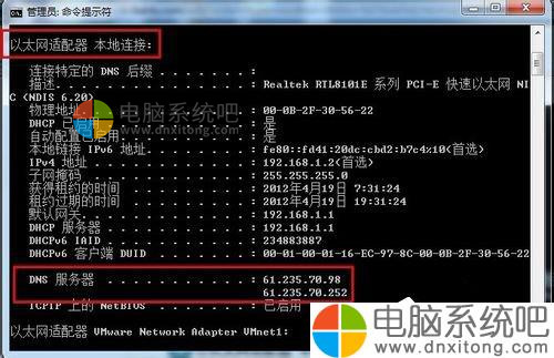 8、在以太网适配器 本地连接下找到DNS服务器,复制提供的地址;