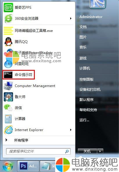 6、单击“开始”菜单,单击“所有程序”,单击“附件”,单击“命令提示符”;