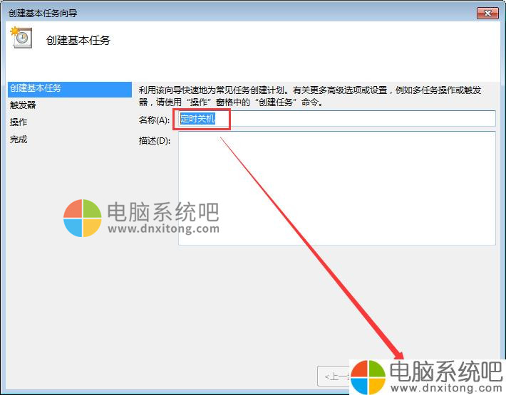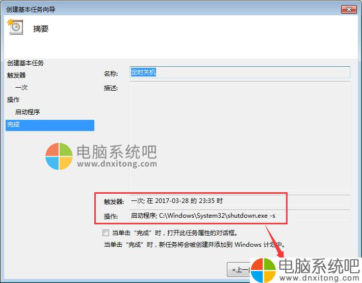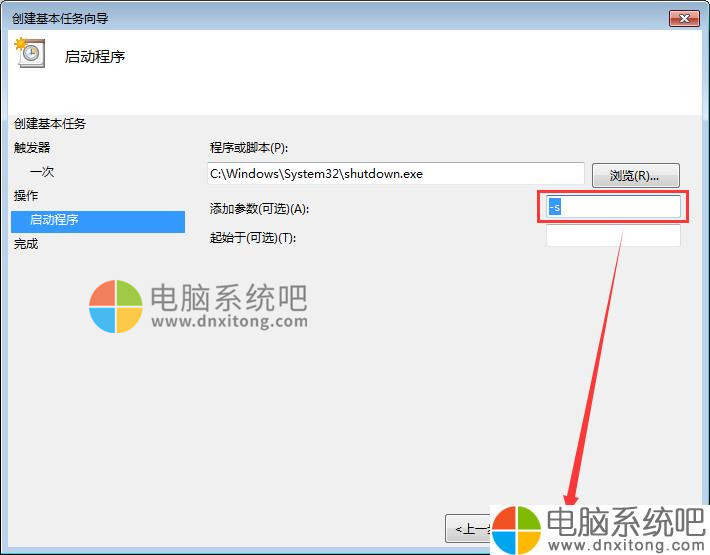 9、如果想关机,在添加参数栏目里输入“-s”,如果是想重启,则输入“-r”(该操作一定要写,否则完成不了),进行下一步;