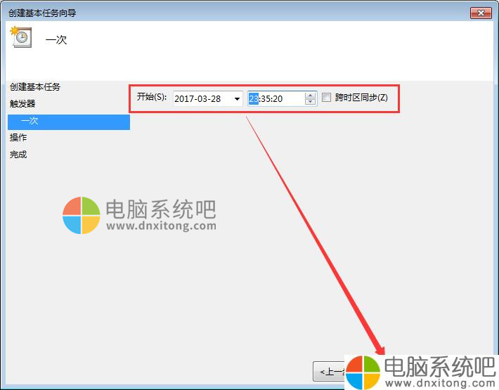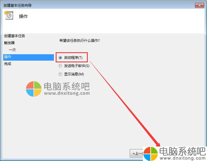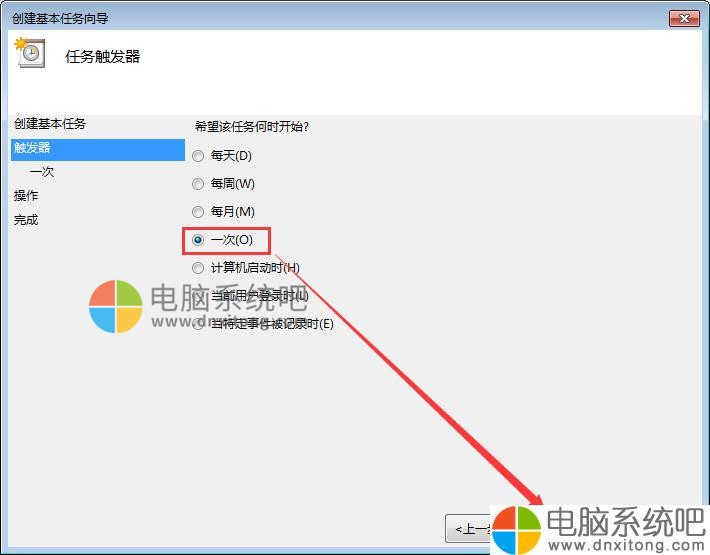 4、在窗口里,有每天、每周、每月、一次各种选择,这里小编选择一次,这次执行完就失效,您可以根据自己的情况进行选择哈,点击下一步;