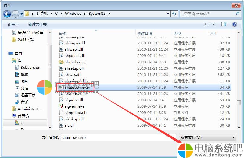 8、找到C:\Windows\System32\Shutdown.exe,点击打开;