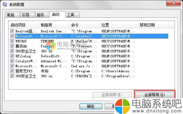 2、在弹出的“电脑系统配置”对话框中,切换到“启动”选项卡,找到前面TEMP下的启动程序并选择“禁用”。