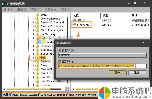 5、在里面找到“run”子项,左键点击“run”,在注册表右边查看有没有异常的开机启动程序,如果有找出来,在注册表里查看他的位置,并它程序删除;