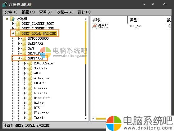 2、找到“HKEY_LOCAL_MACHINE”主键,点左边“小三角”展开,然后点“SOFTWARE”左边“小三角”展开,如图;