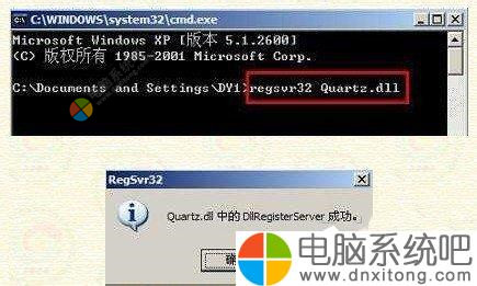 ⒉:在cmd命令提示符中输入regsvr32 Quartz.dll,按下回车键确认,之后电脑系统会提示“Quartz.dll中的DLLRegisterServer成功”,暂时不要关闭cmd命令窗口,继续第3步;