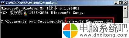 4、再在cmd命令提示符中输入regsvr32 Proppage.dll,按下回车键确认,之后电脑系统会提示“Proppage.dll中的DLLRegisterServer成功”,依然不要关闭cmd命令窗口,继续第四步;