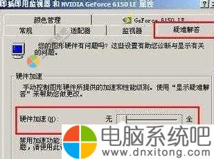 6、检查是否开启了硬件加速,如果开启看硬件加速,可能会占用摄像头程序,因此需要关闭硬件加速,方法为:在桌面空白的地方点击鼠标右键——》选择“属性”—— 》弹出“显示属性”窗口后切换到“设置”选项卡中——》点击右下方的“高级”——》在点击“疑难解答”选项卡——》向左拉滑动条,将中间的“硬件加速(H)”调整为“无”——》点击确定退出;