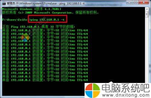 2、在确保硬件线路及设备连接正确的情况下,我们采取以下方法逐个排查故障所在:首先进入MSDOS界面,执行命令“Ping 192.168.0.1”来判断本机与路由器(网关)的连通情况,当无超时现象发生时,即表明线路连接情况正确。