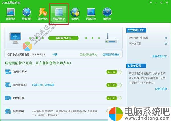 7、我们还可以利用360安全卫士中的“浏量防火墙”来提高局域网的安全性。我们需要开启其中的“ARP防护”、“自动绑定网关”、“IP冲突拦截”以及“对外ARP攻击拦截”项。