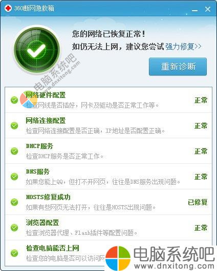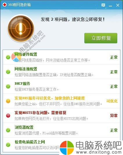 8、当无法确定造成DNS ping不通或者网络时连时断不稳定时,我们可以借用360安全卫士所提供的“断网急救箱”来对整个网络进行诊断,从而找出不能上网的问题。