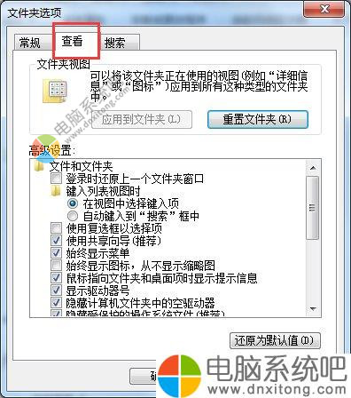 3、文件夹选项窗口,切换到查看页签。