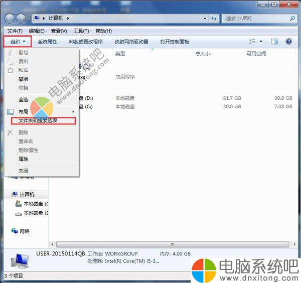 2、打开资源管理器,找到菜单栏的组织功能按钮,下拉菜单中选择文件和搜索选项。