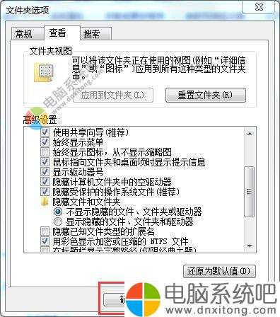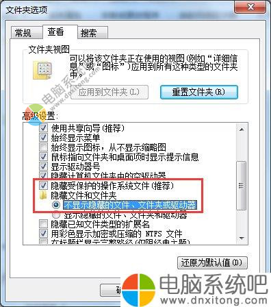 4、高级设置中,选中“隐藏受保护的电脑系统文件(推荐)”和“不现实隐藏的文件、文件夹或驱动器”