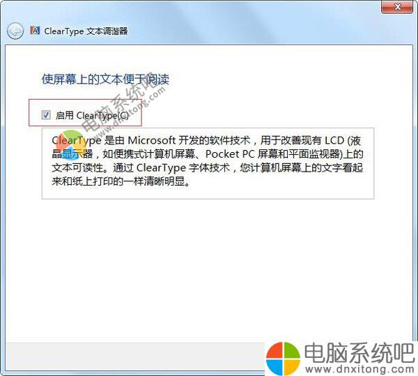4、在弹出的“ClearType文件调谐器”窗口中,勾选“启用ClearType”项,并点击“下一步”按钮。