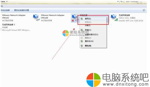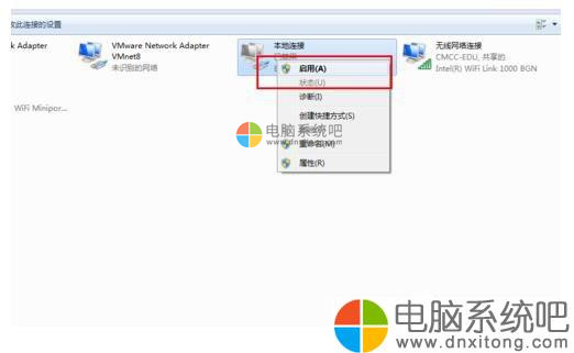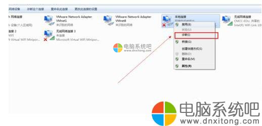 2、在里面我们可以看到我们的电脑中所有的网络连接使用的适配器开启状态。右击,首先我们选择诊断操作看是否能够正常修复。