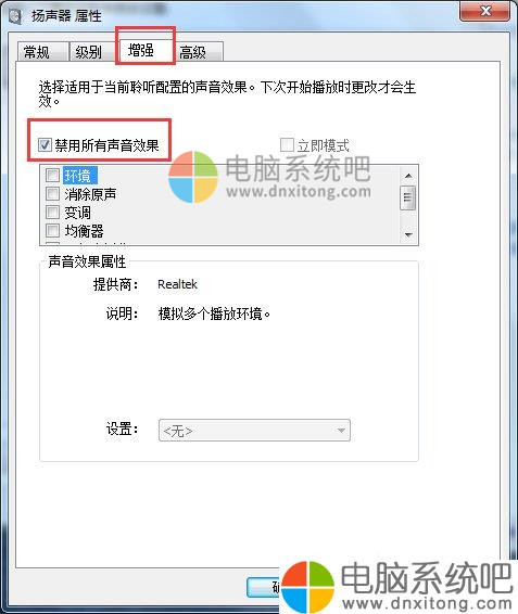 5、在打开的窗口中切换至“增强”选项卡,然后勾选“禁用所有声音效果”,最后点击“确定”按钮完成设置。