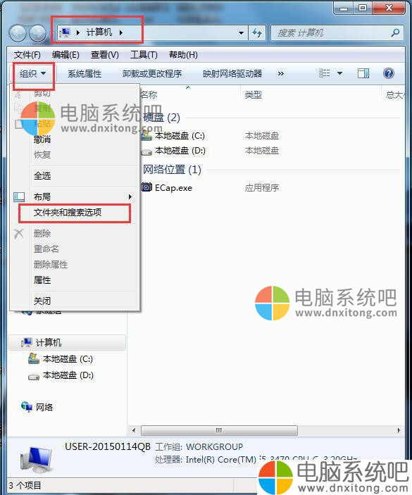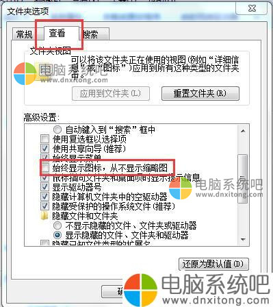 2、操作方法打开的我电脑——组织——文件夹和搜索选项——查看——勾选始终查看显示图标,从不显示缩略图。从而取消缩略图形式显示文件图标。