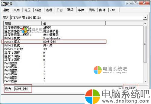 3、我们先到[高级]菜单,在「芯片」的位置选择控制芯片,不太了解的朋友也不用担心,因为通常只有选择了正确的控制芯片才能看到如图中的画面,若选择了其他的是不会有这些选项的。接着,选中「PWM 2 模式」选项,这个选项是指对2号风扇的控制(PWM 1、3、4、5以此类推)。我们需要在下方为其设定控制方式,这里我们要选择「软件控制」。然后[记忆]。 这样我们就可以回到主画面去调整风扇转速了。需要注意的是,有些风扇当转速低于一定程度X%时,风扇会停转,所以记得要关注风扇转速,以免造成损失。对于一般的风扇来说,转速0%时,风扇转速最慢。