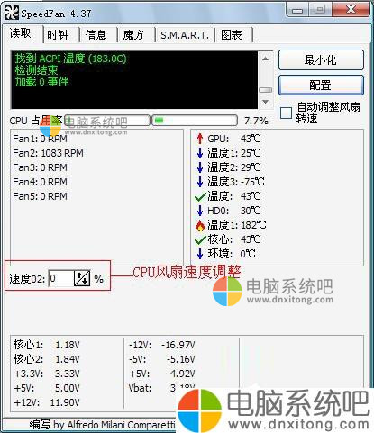 7、下面我们就可以手动调整风扇转速「速度02」,然后发现Fan2转速变化非常明显。由于我们是对CPU风扇Fan2进行调速,所以其它的Fan x数据不用显示。