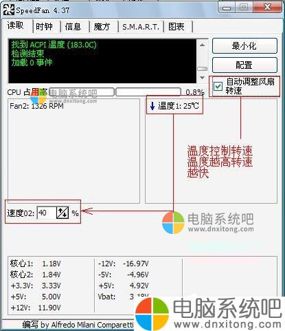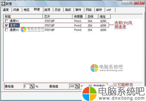 10、最后,将「自动调整风扇转速」打勾。不过需要注意,主板的控制芯片必须被SpeedFan所支持,风扇所在插座必须有调速功能,SpeedFan自动调速才能生效。如果我们让SpeedFan开机自动调速,那么将SpeedFan的快捷方式放入“启动”文件夹,这样软件自然会在开机时自动启动,然后根据CPU温度自动调速。另外配置的时候,按F2键可以更改“速度02”显示为“CPUFAN速度02”,如图所示。