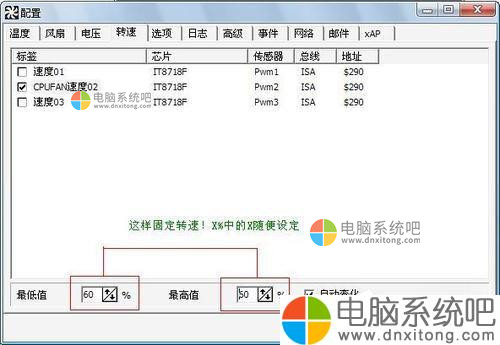 最后,有些人提出:“在SpeedFan里把速度设置到60%,怎么一开机又到了100%?”关于这个问题,主要是速度最高值是多少,SpeedFan开机的初始值就是多少,一般最高值是100%,然后开机时再根据CPU的温度会自动从100%调节转速。如果大家想把速度固定在60%,如图: