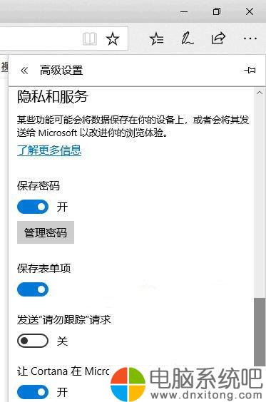 但是如果没有弹出是否保存密码的对话框,则你需要为Edge浏览器手动开启保存密码功能。方法如下: