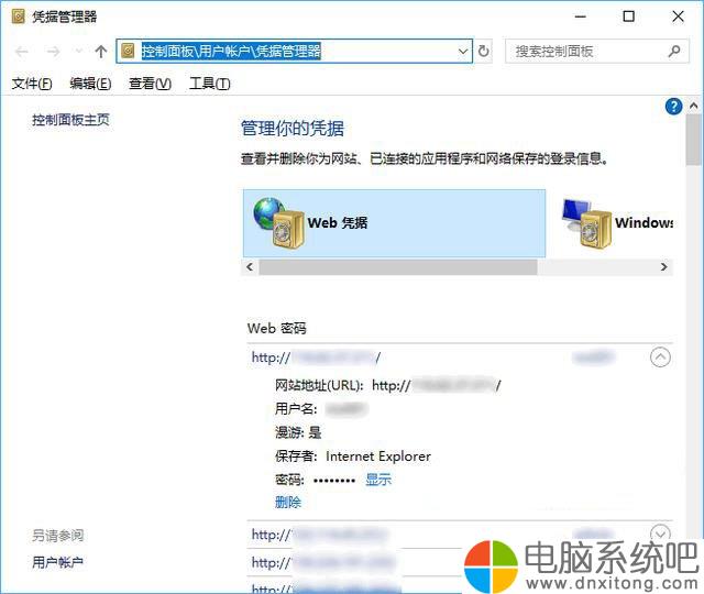 1、在W10任务栏的Cortana小娜搜索框中输入“凭据管理器”,然后点击搜索结果中的“凭据管理器(控制面板)”即可打开“控制面板\用户帐户\凭据管理器”。选中“Web凭据”,下面显示的“Web密码”列表就是IE浏览器和Edge浏览器保存了登录凭据的网址和用户名。