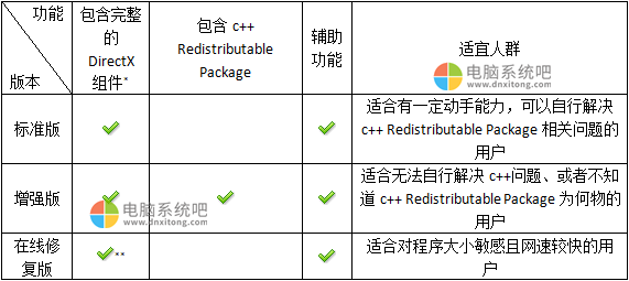 DirectX修复工具,主要针对0xc000007b问题设计,可以完美修复该问题。本程序中包含了最新版的DirectX redist(Jun2010),并且全部DX文件都有Microsoft的数字签名,安全放心。适用于系统缺少运行库、游戏不能运行、工业软件(如QQ,3D*S MAX , MAYA ,Corel Painter等)不能运行提示缺少组件等问题。