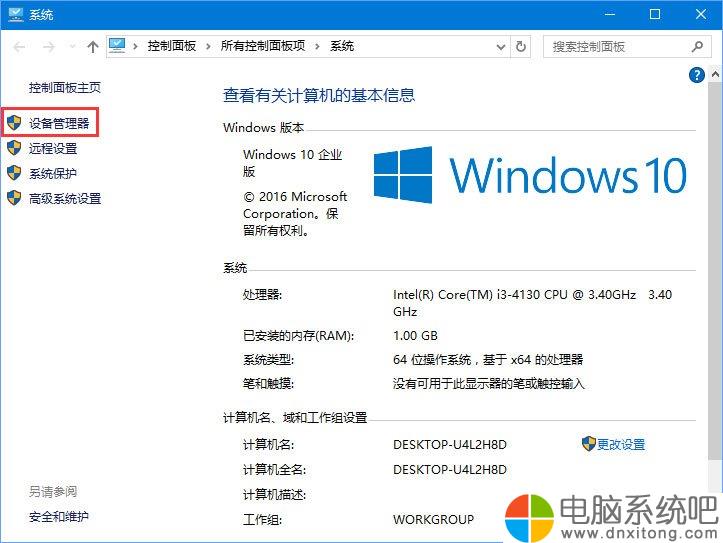 2、在打开的电脑系统属性窗口中,点击左侧边栏的“设备管理器”菜单项。