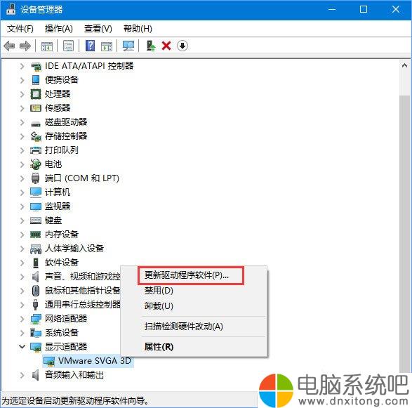 3、在打开的设备管理器窗口中,找到“显示适配器”一项,点击前面的展开按钮,右键点击驱动程序,在弹出菜单中选择“更新驱动程序”菜单项。