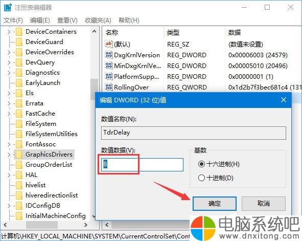 7、把刚刚新建的注册表键值重命名为TdrDelay,然后双击该注册表键值,在打开的编辑窗口中将其数值数据修改为8,最后点击确定按钮。重新启动计算机,再玩吃鸡游戏的时候,就不会再弹出上面的错误提示了。