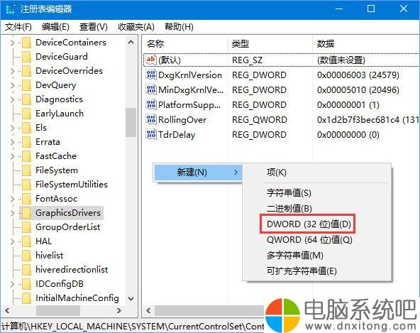 6、在打开的注册表编辑器窗口中,定位到HKEY_LOCAL_MACHINE\SYSTEM\CurrentControlSet\Control\GraphicsDrivers注册表项,在右侧窗口的空白位置点击右键,在弹出菜单中选择“新建/Dword(32位)值”菜单项。