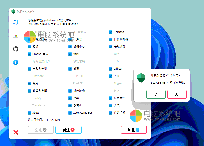 PyDebloatX 是一款系统预装应用卸载工具,直观的设计允许轻松浏览 GUI 并通过点击几下卸载应用程序。使用此工具无法破坏操作系统。所有列出的应用程序都可以通过 Microsoft Store 重新安装。GUI 不需要提升的管理员权限即可运行。它也不保存注册表项。