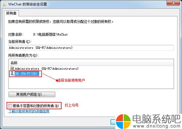 4、在“将所有者更改为”下面框内选择我们所登入的用户账户,然后勾选“替换子容器和对象的所有者”,点击确定;