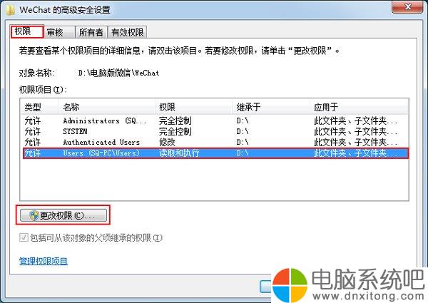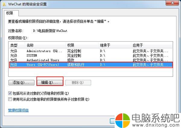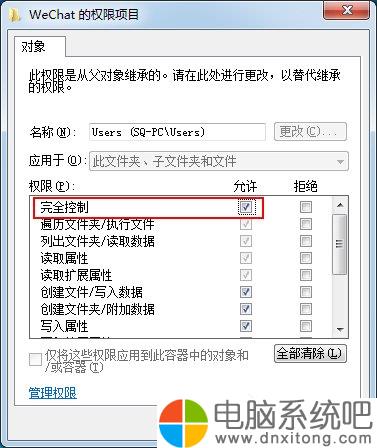 7、然后在高级设置窗口勾选最下面的“包括可从该对象的父项继承的权限”和“使用可从此对象继承的权限替换所有子对象权限”,然后点击应用并确定即可。