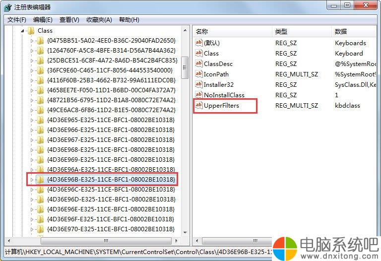 6、接着打开注册表找到我们刚才的位置在【{4D36E96B-E325-11CE-BFC1-08002BE10318}】项下添加【UpperFilter】;