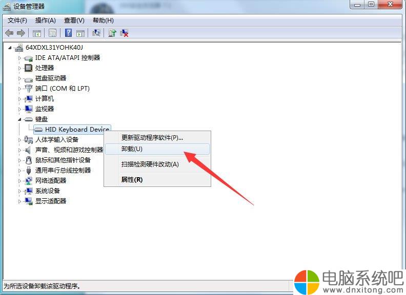 5、进入设备管理器找到键盘驱动,右键点击将其卸载,卸载完成然后再重新启动;
