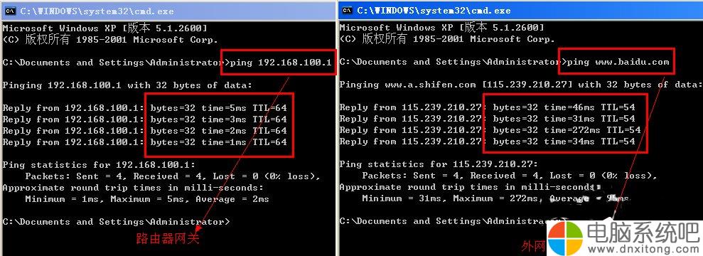 如上图获取到了ip地址,那么我们分别ping一下路由器的网关和任意外网(以百度网址为例),如果ping路由不通的话就需要看下电脑网卡ip地址是否是从路由器自动获取的或者尝试手动配置一个内网的ip;如果ping的通路由 ping不通外网(百度网址),此时问题应该在路由器的设置上,看下路由器是否获取到了外网ip。