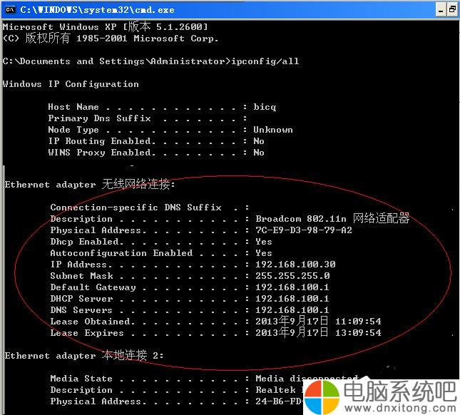 Windows键+R键——出现“运行”窗口——输入“cmd”—-按回车键—出现“命令提示符”对话框——-输入“ipconfig/all”回车查看是否获取到了ip地址。